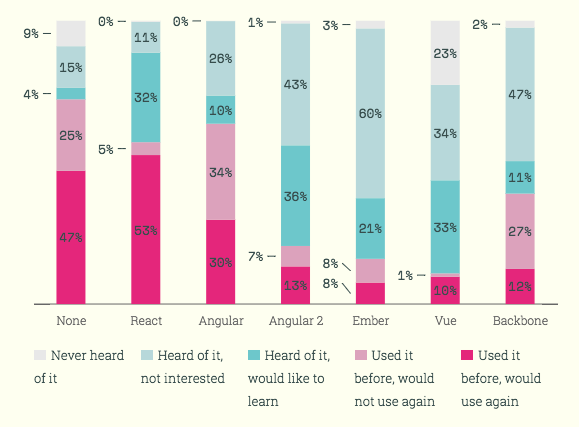 This section will focus on the view-library React. It was created by Facebook and it's popularity is continuously increasing. Currently, it is the most popular JavaScript framework, according to State Of JavaScript.